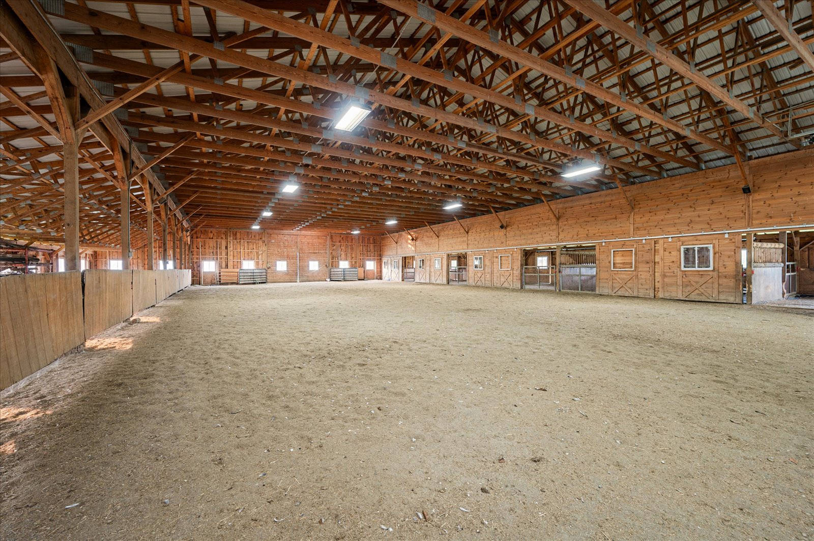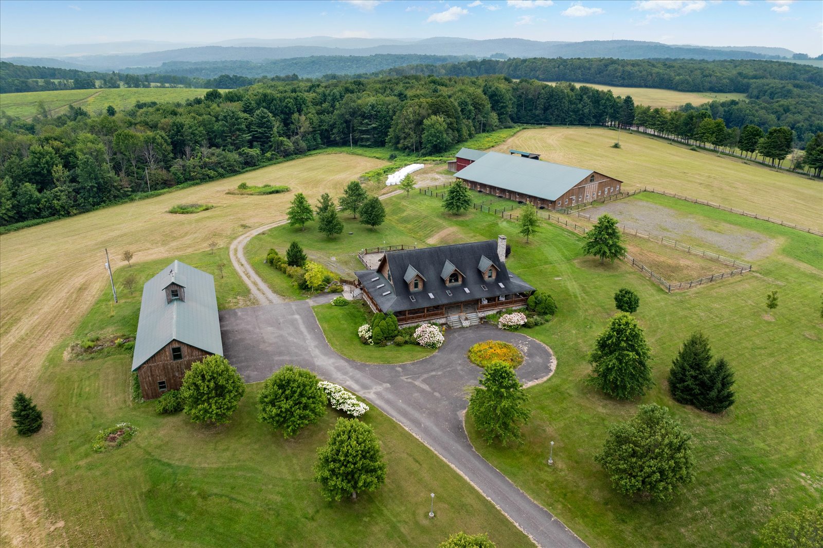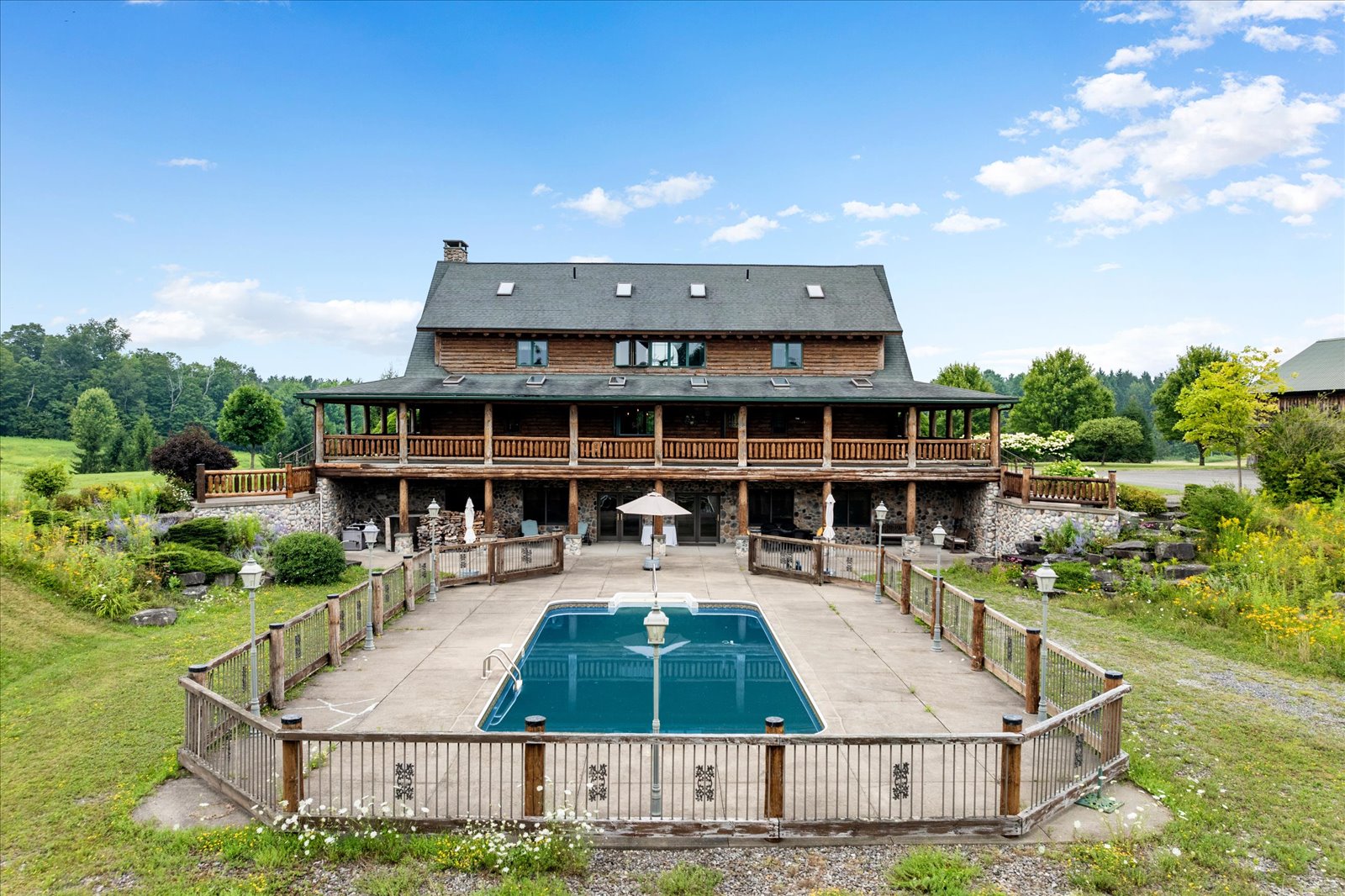 One of a kind gem. Country charm with a blend of elegance. Stately 5500 square foot 3 bedroom, all with private bath. Log home with wrap around porch on 71 scenic acres. The primary 1st floor suite has a cozy stone fireplace, finished basement, features granite flooring, full bar, large stone fire place, pool table, full bath and walk out to access the ingrounds pool area. Large indoor arena with real nice apartment above. Frost free waterers in six 20 x 24 stalls with room for additional twelve 10 x 12 stalls. Also has large outside arena and large 5 bay garage. The Brookfield state land is just down the road with 130 miles of horse riding trails& camp sites.